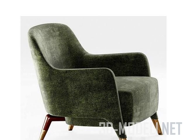 Кресло D.151.4, обтянутое черно–зеленым плюшем. Мягкая подушка сиденья, подлокотники с закругленными углами, переходящие в спинку базируются на расставленных невысоких деревянных ножках с латунными наконечниками. Производитель кресла - Итальянская фабрика. Габариты изделия – 700 х 740 х 750 мм.