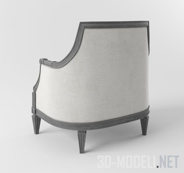 Классическое мягкое светло-серое кресло на коротких ножках. Кресло отличается трапецевидной спинкой. По всему контуру кресло отделано резным деревом темно-серого цвета. 3D модель смотрится очень реалистично.