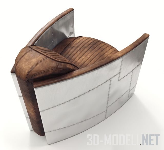Оригинальное кресло в стиле стимпанк, от Timothy Oulton из коллекции Aviator. Модель названа в честь военного истребителя Grumman F-14 Tomcat, вдохновившего автора. Подлокотники отделаны кусками аллюминиевых пластин с проклепкой по швам и напоминают плоскости крыльев самолета. По верхней кромке подлокотников размещена мягкая вставка, обтянутая рустикальной коричневой кожей. Из такой же кожи изготовлена и обивка сиденья кресла. Сиденье повторяет очертания самолетного кресла, с ребристыми вставками и простроченными элементами.