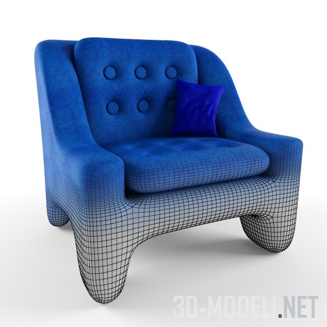 Современное кресло с обтекаемыми формами, с декоративными втяжками на спинке и сиденье, а также с маленькой декоративной подушкой. Обивка кресла и чехол подушки - насыщенного синего цвета «электрик».