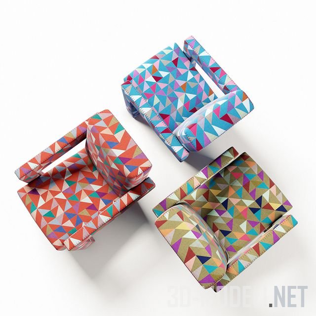 Массивное квадратное кресло, каркас которого сделан из массива пихты и фанеры тополя; подлокотники - из массива тополя. Ножки из черного пластика. Полиуретановая обивка обтянута яркой веселой жаккардовой тканью с геометрическим рисунком и с тонкой офсетной строчкой нейтрального цвета.