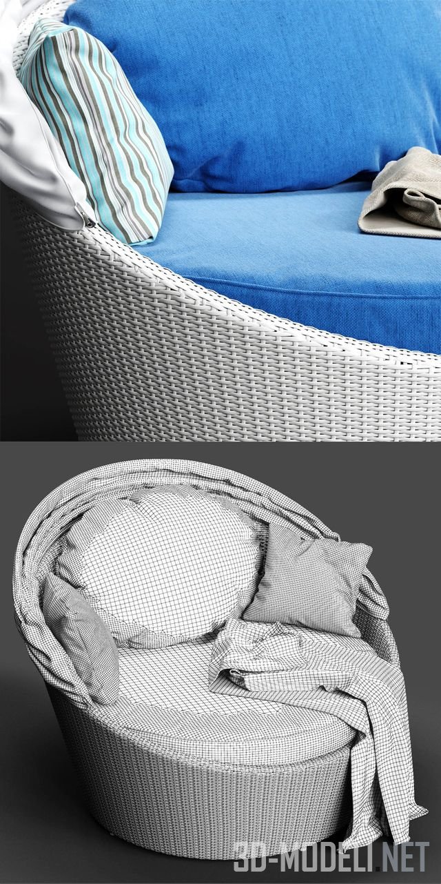 Белое плетеное кресло от итальянского производителя Varaschin, серия Arena. Подушки сиденья и спинки выполнены в синей ткани, что прекрасно подчеркивает стилистику мебели, предназначенной для полноценного отдыха на свежем воздухе. Декоративные подушки на сиденье имеют чехлы в полоску. Размеры кресла: 132 x 132 x 106 см.