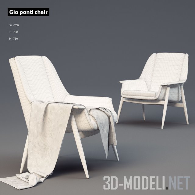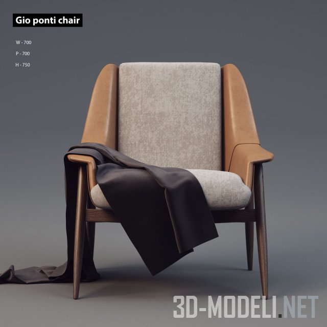 Два варианта кресла Gio Ponti, размер 700 x 700 x 750 мм. Кресло показано в комбинированной и сплошной обивке. Ножки и основа выполнены из дерева. Плед (кусок ткани) живописно наброшен и добавляет модели еще больший реализм и достоверность.