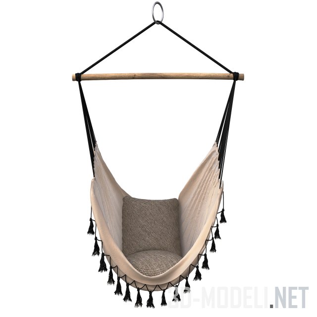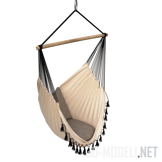 Удобное современное кресло-гамак, модель HAMMOCK Provincial White 14000CRM от российского бренда MIR. Гамак бежевого цвета, с плоскими мягкими подушками внутри и декорированный черными кисточками по передней поверхности. Натягивающие его крепежные шнуры тоже черного цвета.