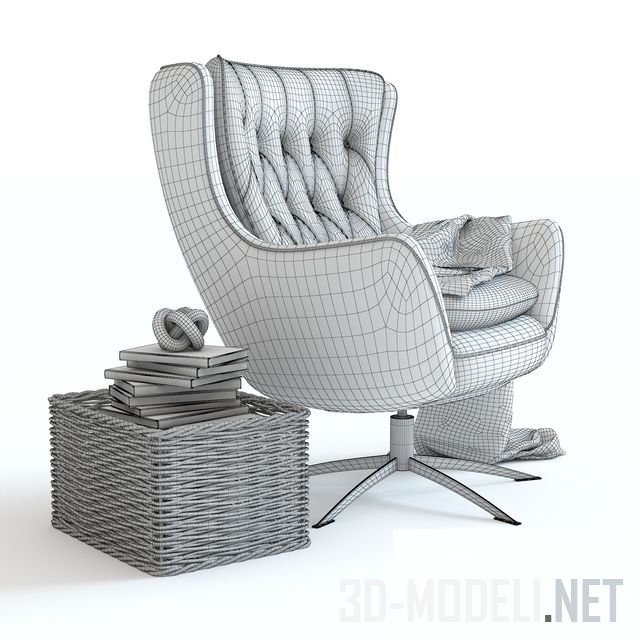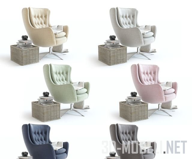 Большое мягкое кресло Wells от Pottery Barn. Кресло с прострочкой капитоне на спинке и сиденье. Опирается на металлическую крестовину и имеет поворотный механизм. Обивка представлена в пяти вариантах цветовой гаммы. Рядом с креслом стоит большая плетеная корзина с книгами.