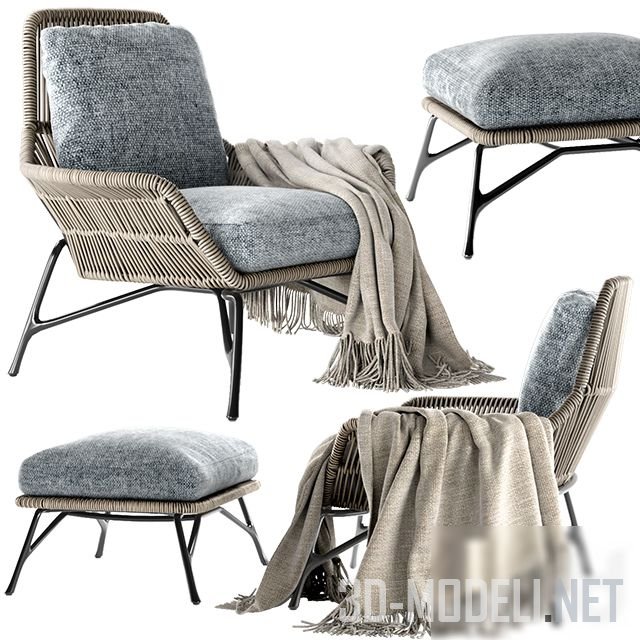 Плетеные из кожи кресло и пуф Prince Cord от итальянского бренда Minotti, выполнены в стиле американского модернизма. В качестве обивки подушек выбран материал серо-голубого цвета На кресле лежит большой светлый плед. Размер кресла: 830 х 880 х 850 мм.