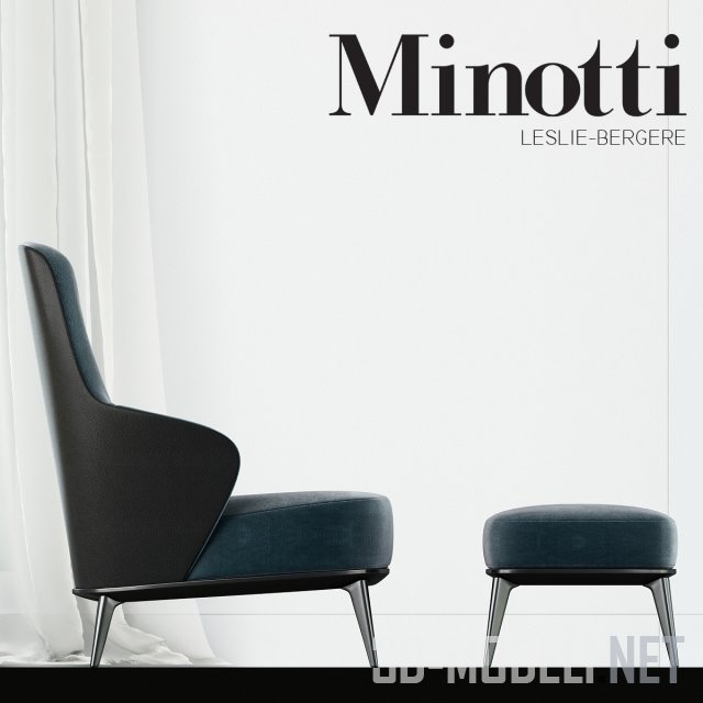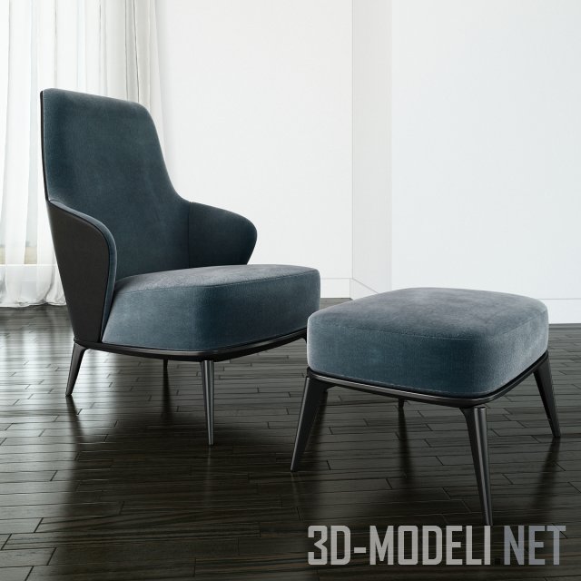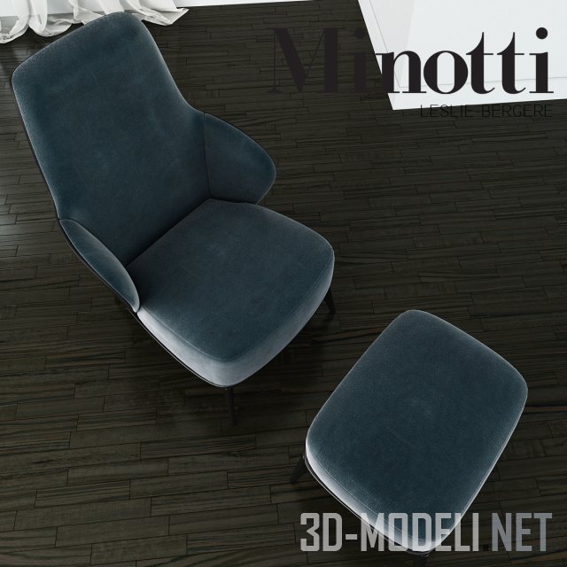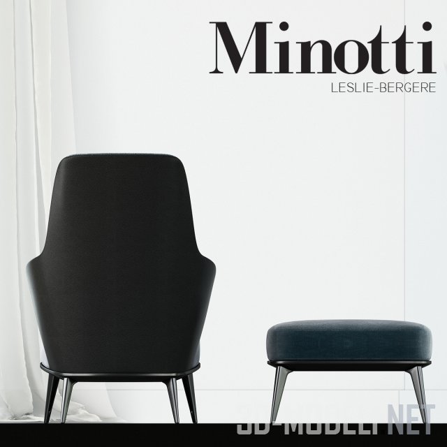 Современное элегантное кресло с высокой спинкой и пуф Leslie от итальянской фабрики Minotti. Кресло и пуф обтянуты красивым велюром глубокого мятного цвета, красиво сочетающегося с черной глянцевой рамой и ножками.