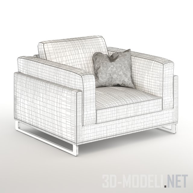 Современное кресло с яркой обивкой, которая хорошо подчеркивает его просторную геометричную форму. Золотистые ножки отлично гармонируют с тканью.