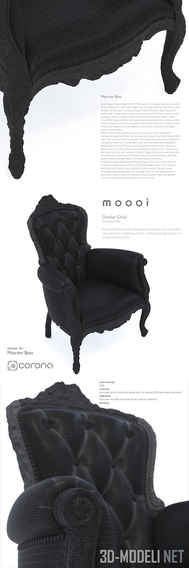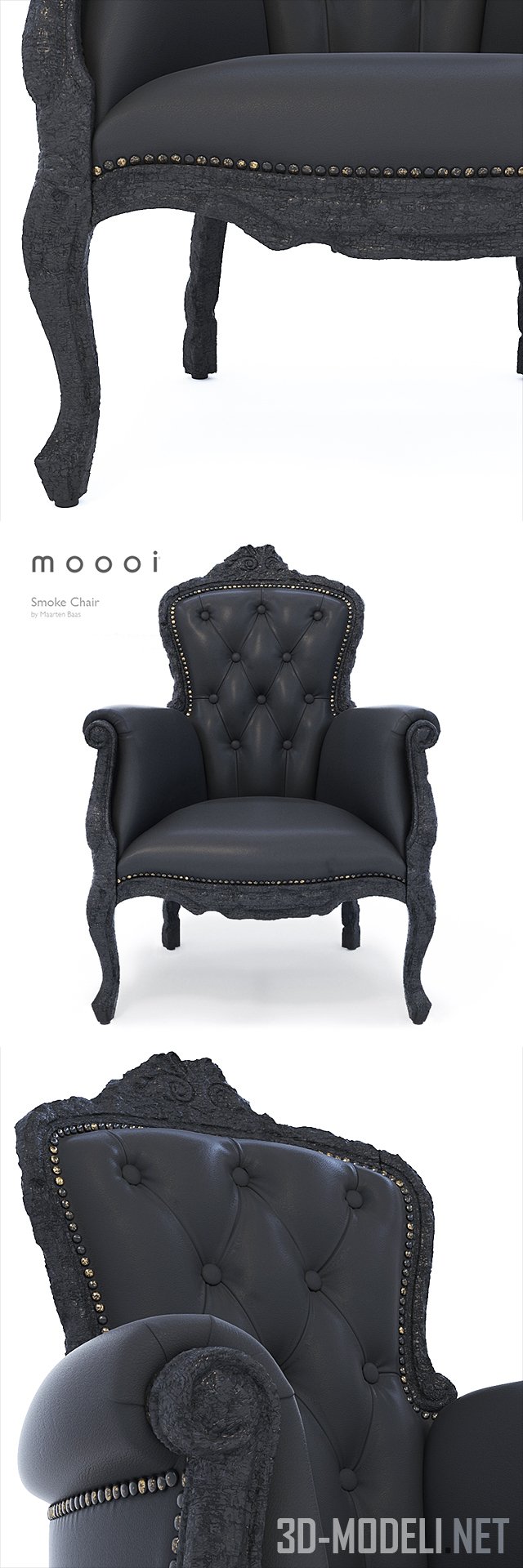 Кресло MOOOI Smoke, выполнено в классическом стиле. Оснащено высокой спинкой, украшенной резьбой и отделанной декоративной простежкой капитоне с пуговицами на пересечениях строчек. Гнутые ножки и подлокотники тоже украшены резьбой. Кресло обтянуто темной дымчатой кожей и отделано множеством золотых декоративных гвоздиков.
