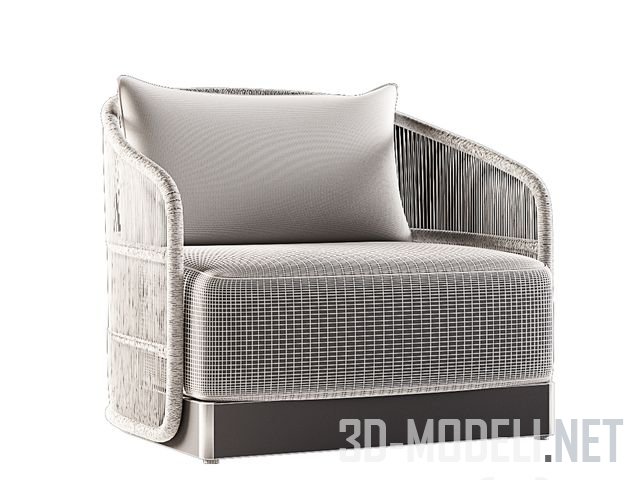 Современное лаунж-кресло Havana от бренда Restoration Hardware, предназначено для использования на открытых площадках. На небольшой деревянной квадратной площадке разместилась высокая мягкая подушка сиденья, в чехле белого цвета. Еще одна мягкая подушка служит спинкой. Цельная закругленная конструкция подлокотников и спинки изготовлена в стиле мебели из ротанга: на гнутую раму из трубы натянуты вертикальные нити коричневого цвета.