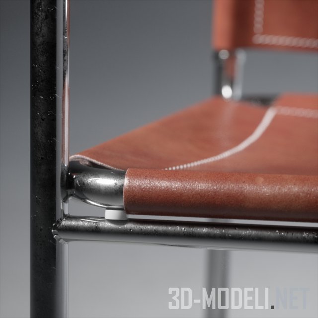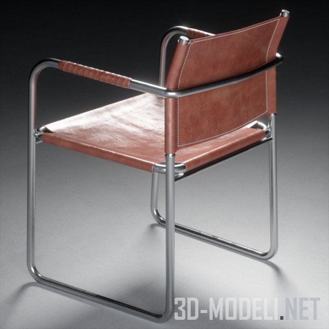 Кресло Amiral FStorm от IKEA на легкой металлической раме. На плоскости сиденья и спинки натянуты куски рыжей плотной кожи, простроченной белой ниткой. На подлокотниках метал обернут кожаной лентой такого же цвета, что и кожа на сиденье и спинке.