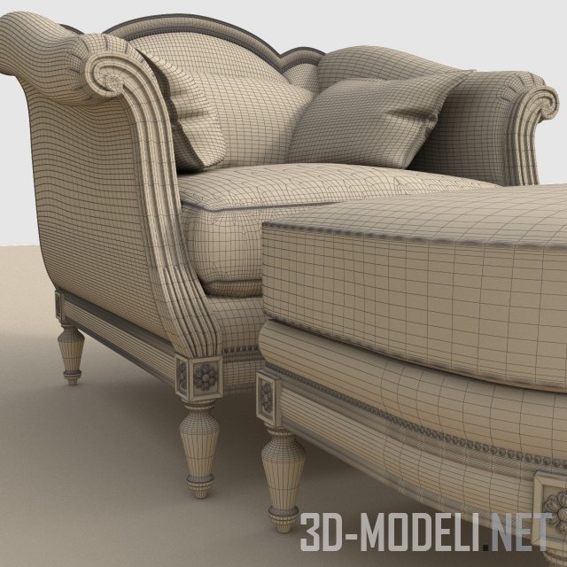 Приземистое классическое кресло и оттоманка Sorrento Thomasville. Деревянные элементы мебели украшены резьбой. Мягкие сиденья обтянуты светло-бежевым плюшем. Основная обтяжка - светло-коричневая кожа. Спинка кресла дополнительно декорирована полосатой желто-черной подушкой. Размеры мебели: кресло 112 х 102 х 99 см, оттоманка 86 х 74 х 51 см.