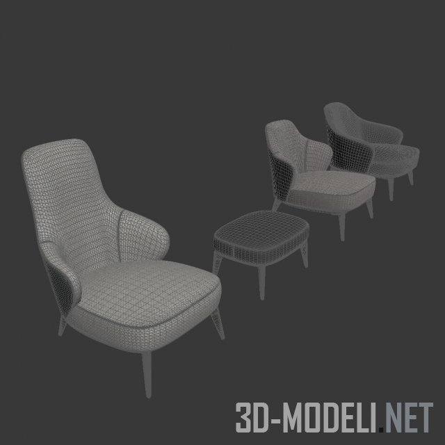 Мебельный сет Minotti Leslie, состоящий из трех различных кресел и черной кожаной банкетки. Одно из кресел обтянуто черной кожей, одно - велюром серого цвета. Третье кресло с самой высокой спинкой обтянуто серо-белой тканью в плотный рубчик.