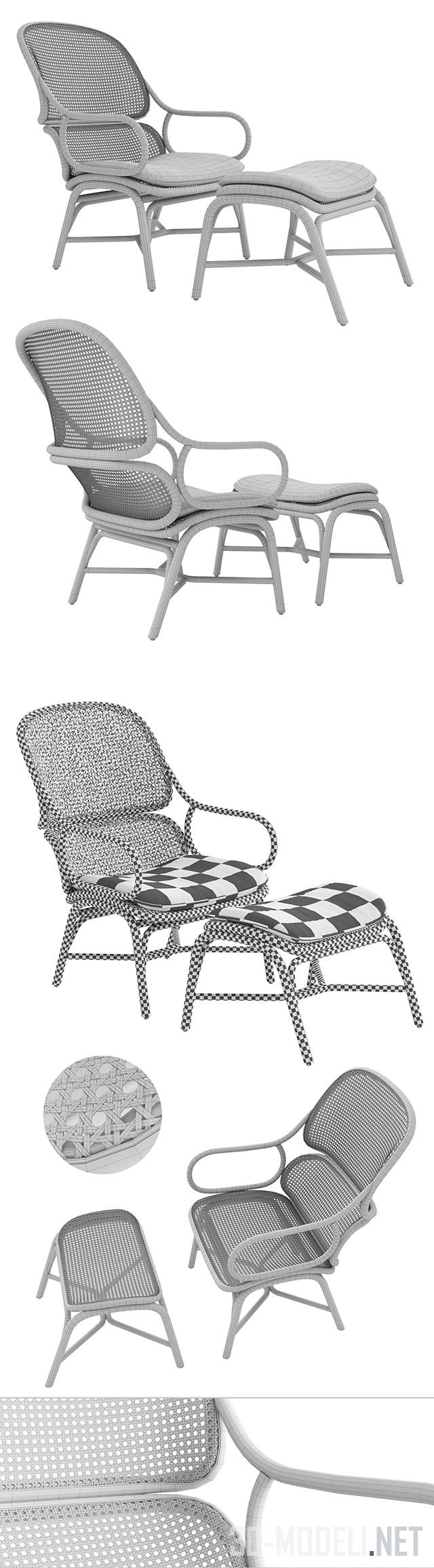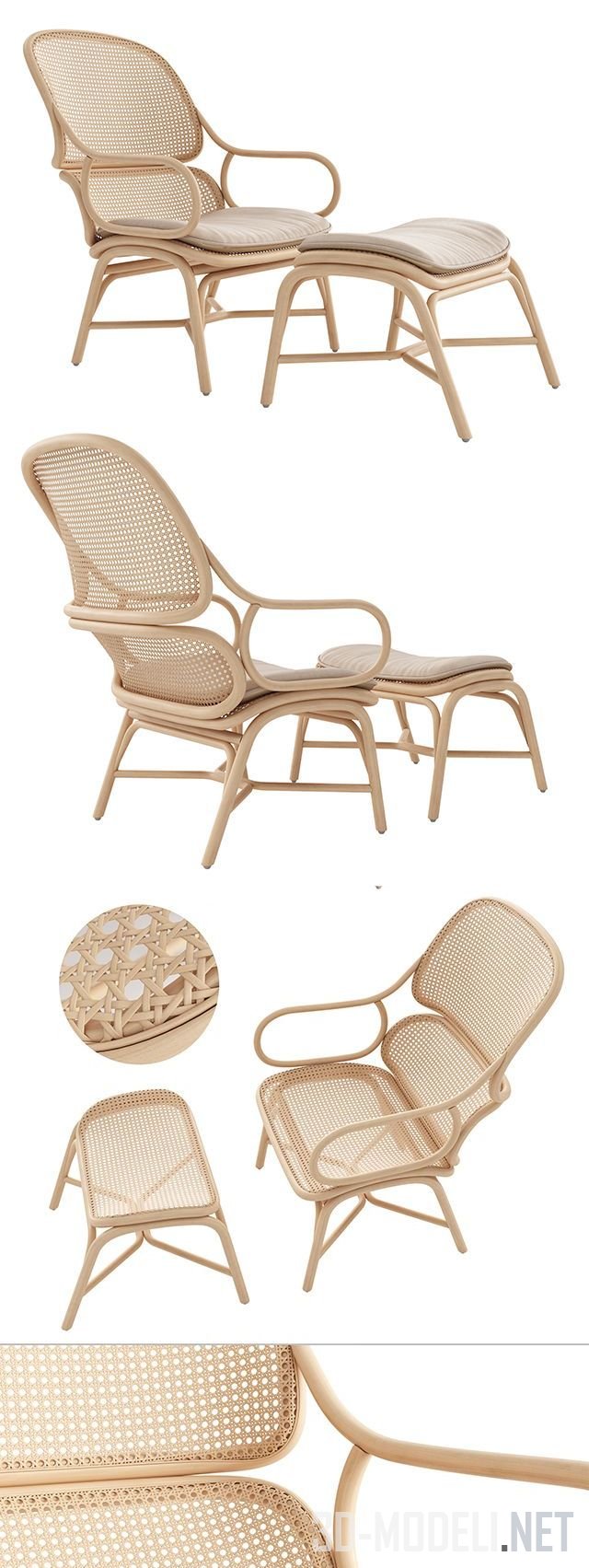 Кресло и оттоманка Frames от испанского бренда Expormim, разработка дизайнера Jaime Hayon. Предметы мебели сделаны из очищенного и тонированного натурального ротанга светло-бежевого цвета диаметром 28 мм. Сиденье и спинка изготовлены из тонированного натурального плетения («восьмиугольное плетение»), а ножки – из ротанга. Дополнительные подушки на сиденье выполнены из светлого текстиля. Размеры кресла: 67 x 82 x 104 см.
