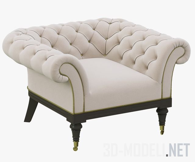 Большое мягкое кресло Islington Chesterfield Upholstered Chair от Restoration Hardware. Кресло обтянуто белой мягкой дорогой тканью с простежкой капитоне и отделано строчкой из золотых декоративных гвоздиков. Спинка и подлокотники закруглены и отогнуты назад. Фигурные деревянные ножки спереди заканчиваются золотыми маленькими колесиками.