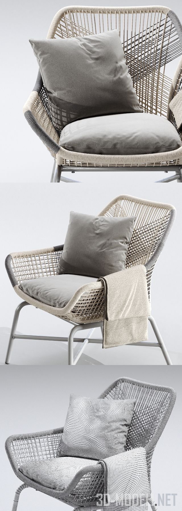 Небольшое кресло для отдыха, модель Huron Outdoor от West elm. Кресло сплетено из ротанга на базе из алюминиевой трубки. Кремовый цвет ротанга красиво сочетается с подушками серого цвета и легким пледом.