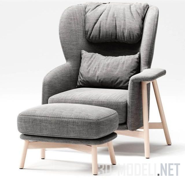 Большое мягкое кресло KEPI с высокой спинкой с ушами и двумя подушками вверху и внизу спинки. Производитель: Saba Italia. Кресло стоит на небольших ножках из светлого дерева. Его размер 90 х 89 х 105 см.