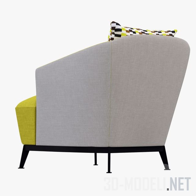 Мягкое и удобное кресло от французского производителя Roche Bobois, модель Orlando. Темного цвета основа и ножки кресла хорошо гармонируют с комбинированной обивкой (текстиль серого и желтого оттенков). Пестрая декоративная подушка отлично вписывается в дизайн.