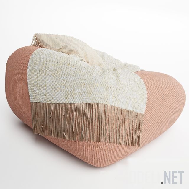 Кресло отличает обивка нежного цвета (съемная, предлагается в ассортименте тканей), а также уютная подушка и плед с бахромой.