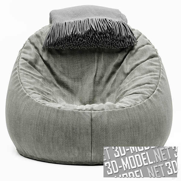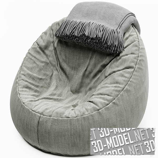 Мягкое кресло-мешок в сером текстильном чехле. На спинке кресла лежит свернутый серый плед с бахромой по краю.