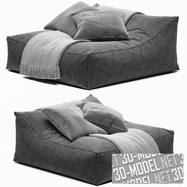 Современное бескаркасное кресло-реклайнер, сильное и удобное. На кресло наброшен плед с бахромой, что придает ему реалистичный и уютный вид. Обивка из ткани.