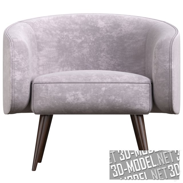 Кресло Yoisho в стиле середины ХХго века. Мягкий корпус со скругленной спинкой, переходящей в подлокотники размещены на четырех, сужающихся книзу деревянных ножках под темным лаком. Обивка мягких элементов - бледно-лавандовый велюр.
