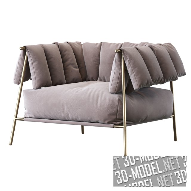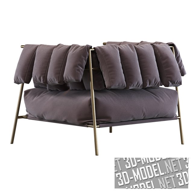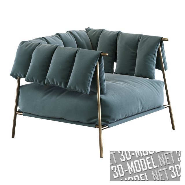 Современное кресло из подушек на металлическом каркасе из трубок Tirella от Bonaldo (дизайнер Paolo Grasselli). Представлены четыре варианта текстурированного велюра обивки: пыльно-розовый, серо-сине-зеленый, светло-серый и серый. Высокое сиденье кресла выполнено в виде простой квадратной подушки. А вот подлокотники и спинка реализованы оригинально. Эти элементы изготовлены в виде узких подушек, перегибающихся и развешанных на общей верхней перемычке каркаса. Габарит: 71х97х81см.