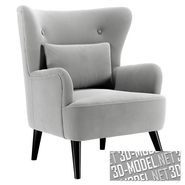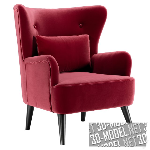 Большое уютное кресло Ottavia, обтянутое плотным текстилем серого, красного или голубого цвета. Спинка с ушами и декоративными пуговицами комфортна и удобна. на сиденье лежит небольшая подушка в цвет обивки. Кресло стоит на круглых конических ножках коричневого цвета.