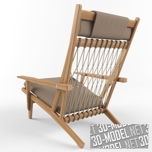 Современное кресло от Hans Wegner, отличный вариант для отдыха на летней площадке, террасе или пляже. Основа кресла - деревянный каркас с подлокотниками. Мягкое сиденье и плоская горизонтальная подушка обита материалом цвета льняного холста. Плоскость высокой спинки заполнена гамачным плетением из тонкого шнура в цвет обивки. Габарит кресла: 90х75х90см.