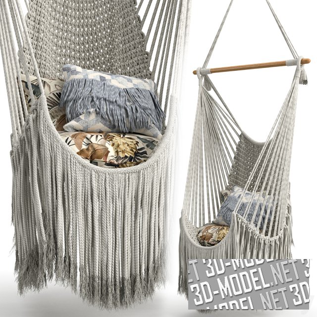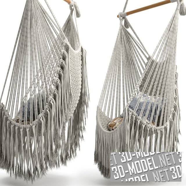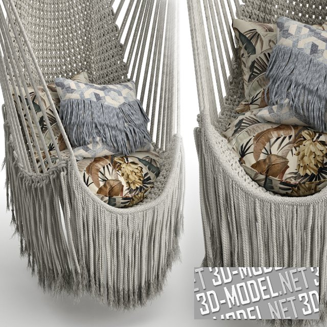 Расслабляющим, уютным и стильным вариантом мебели для отдыха для интерьера в стилистике бохо-шик станет это подвесное кресло Babylonica. Плетеное из веревки в технике макраме, кресло смотрится невероятно эстетично и привлекательно. Трехмерная модель выполнена на высоком уровне детализации, архив содержит текстуры высокого разрешения и материалы Vray.