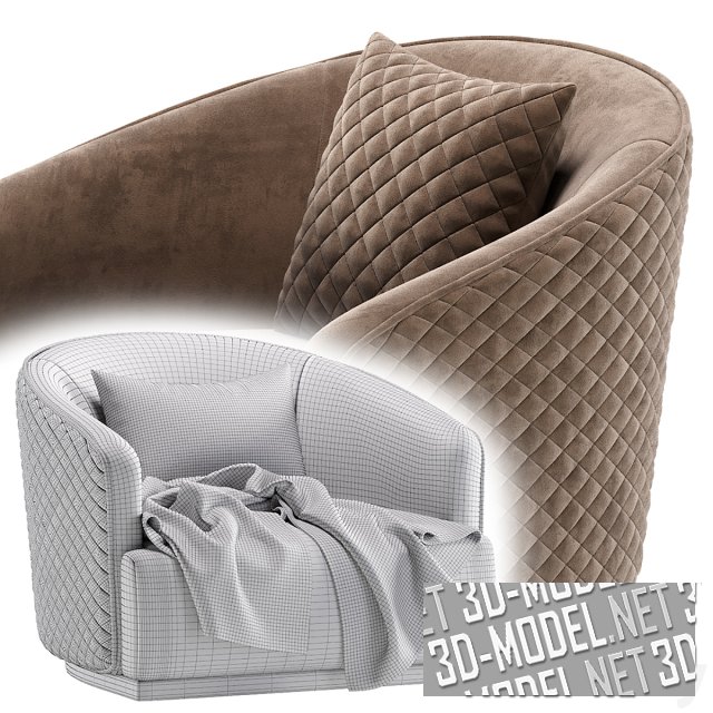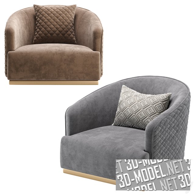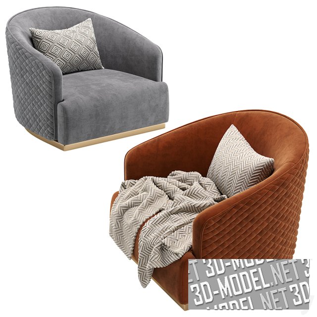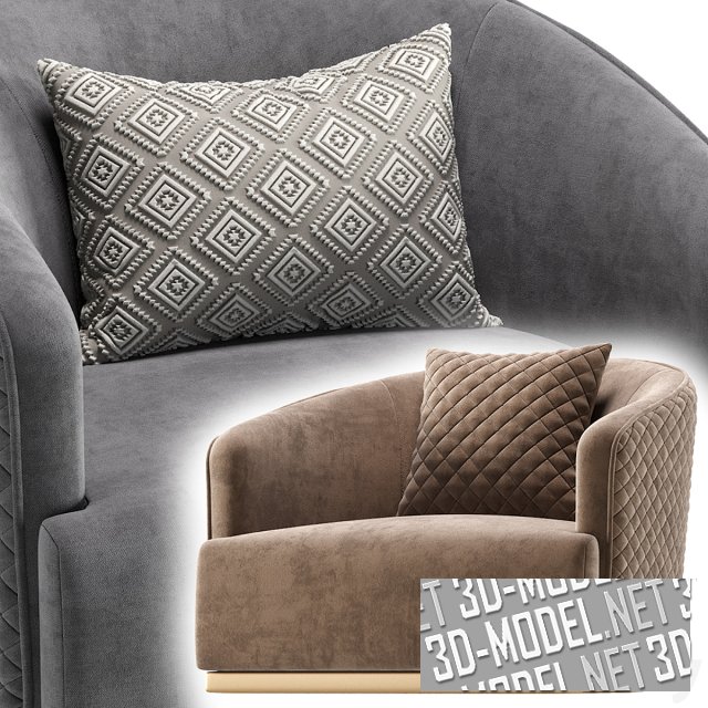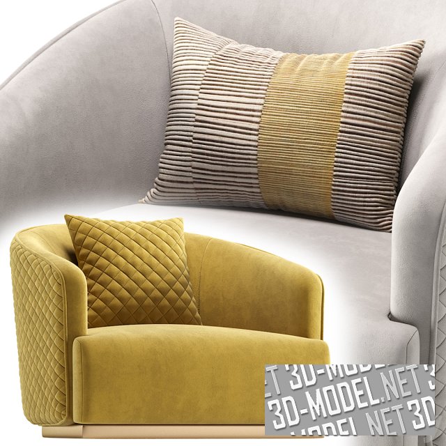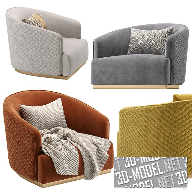 Массивное кресло RUDAS от Cazarina Interiors в пяти вариантах обивки. Наружная плоскость огибающей спинки декорирована простежкой, образующей небольшие равносторонние ромбы. Невысокое золотистое основание кресла - квадратного сечения. Велюровая обивка представлена в следующих цветах: желтая, светло-серая, бледно-коричневая, серая и коричнево-охристая. Каждый из вариантов дополнен подушками в чехлах с простежкой или с орнаментом. На одном из кресел плед с рельефной елочкой.