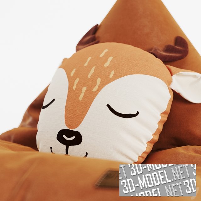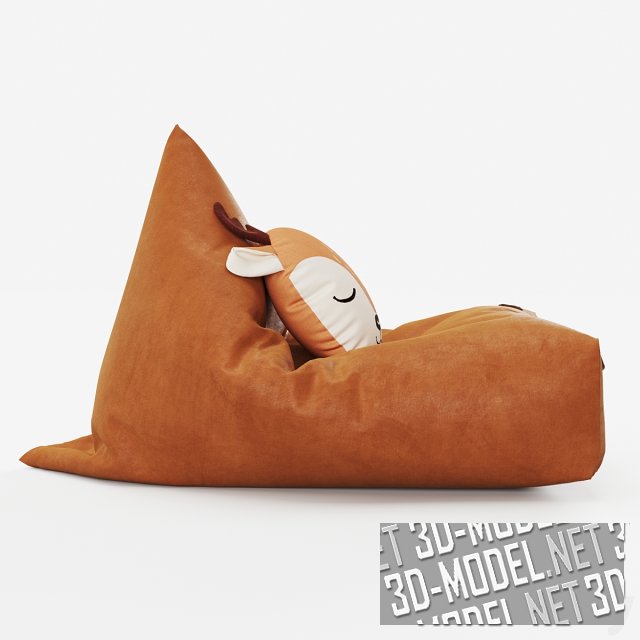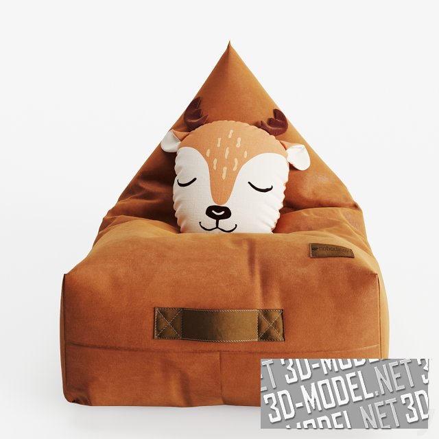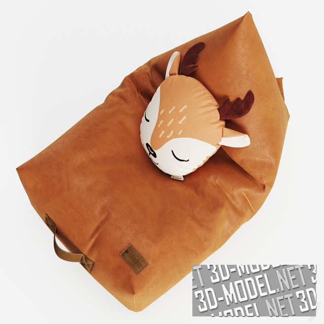 Кресло-мешок и подушка в виде головы оленя от испанского производителя NOBODINOZ. Чехол кресла выполнен из грубого материала, слегка напоминающего отделаную оленью кожу рыжего цвета. К переднему торцу кресла пришита мощная тканевая ручка светло-коричневого цвета.