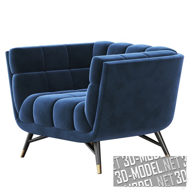 Современное кресло Adept Performance с низкой спинкой в уровень с подлокотниками. В «коробку» основания кресла уложена вставка из мягких кубиков, образующих уютное сиденье и огибающую спинку. Основание кресла смонтировано на невысоких черных деревянных ножках с распорами и золотистыми металлическими наконечниками.