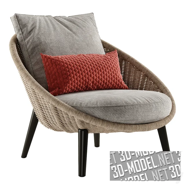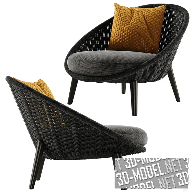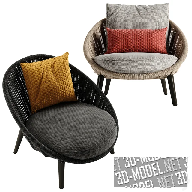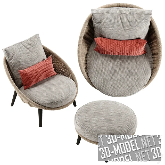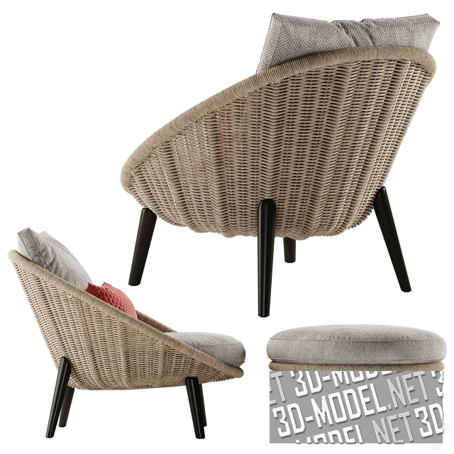 Кресло и круглая подставка для ног Lido Cord от итальянского бренда Minotti. Основания изделий сплетены из прочного шнура (представлены два варианта: черный и цвета мешковины) на металлическом каркасе и установлены на черных деревянных ножках. В основания уложены круглые (на сиденьях) и квадратные (на спинке) подушки в светло-серых чехлах. Дополнительные декоративные подушки с рельефом в виде сот - терракотового и золотисто-желтого цветов. Габариты кресла: 88х95х82см. Габарит круглой оттоманки: d74/h42см.