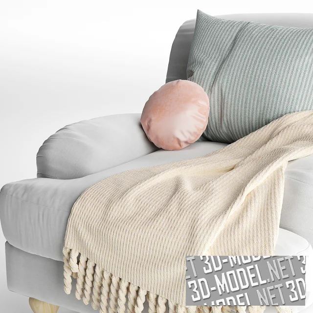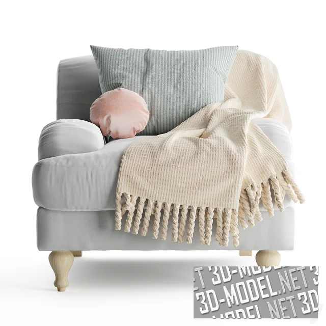 Массивное классическое кресло Rose Fabric от Interior Define на точеных деревянных невысоких ножках. Широкие и невысокие подлокотники, небольшая толстая мягкая спинка и высокое массивное сиденье обиты текстилем светло-серого цвета. Габарит кресла: 86х100х84см. На кресло наброшены круглая бледно-коралловая подушка, квадратная подушка с мелкой бледной сине-зеленой полоской и бледно-бежевый плед с декоративной бахромой на коротких сторонах.
