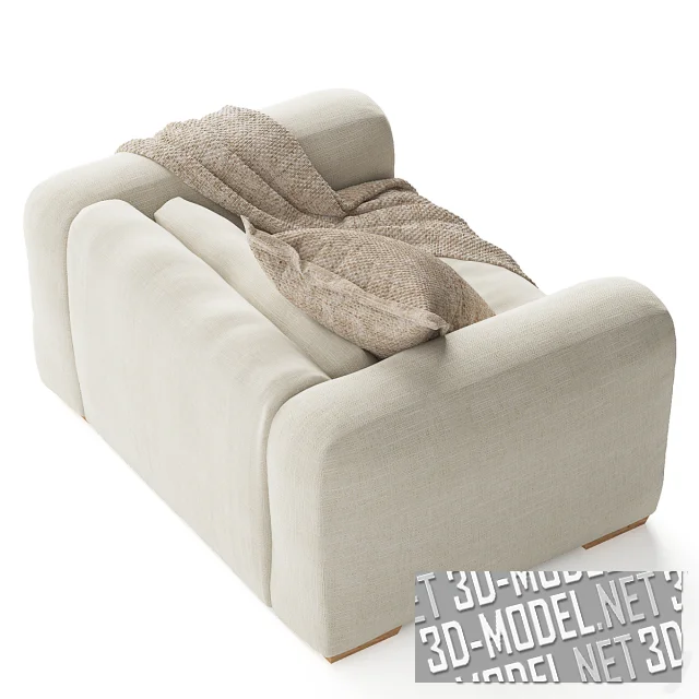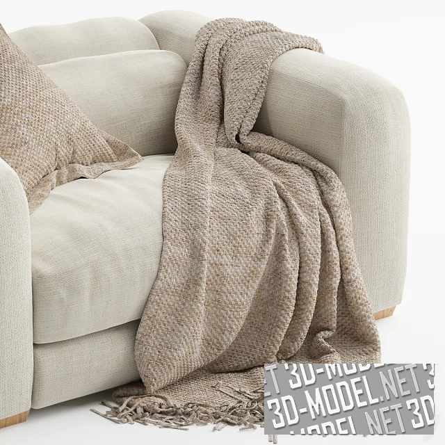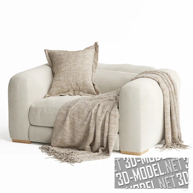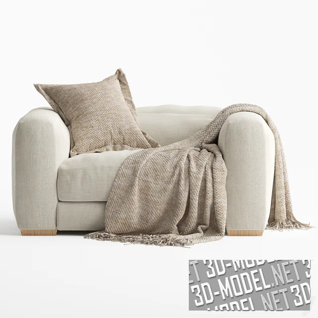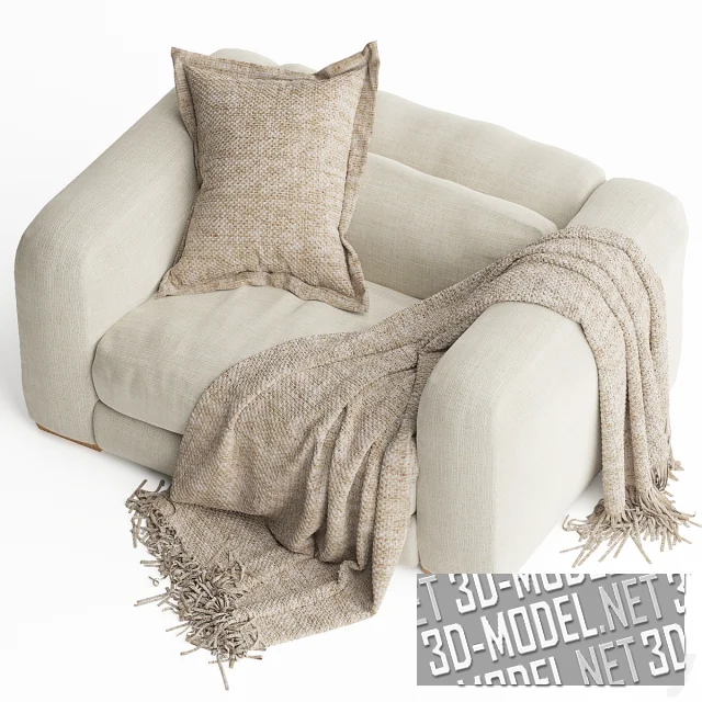 Широкое современное массивное кресло (одноместный диван) с низкой посадкой - Mukuru Uniqwa Collections. Толстые мягкие прямые низкие подлокотники и спинка дополнены низкой горизонтальной подушкой. Ножки широкие, низкие, деревянные. Обивка - светло-серый поликоттон. На поверхности подушка и плед из ткани с крупной текстурой волокон, цвета мешковины. Габарит кресла: 138х102х70см.