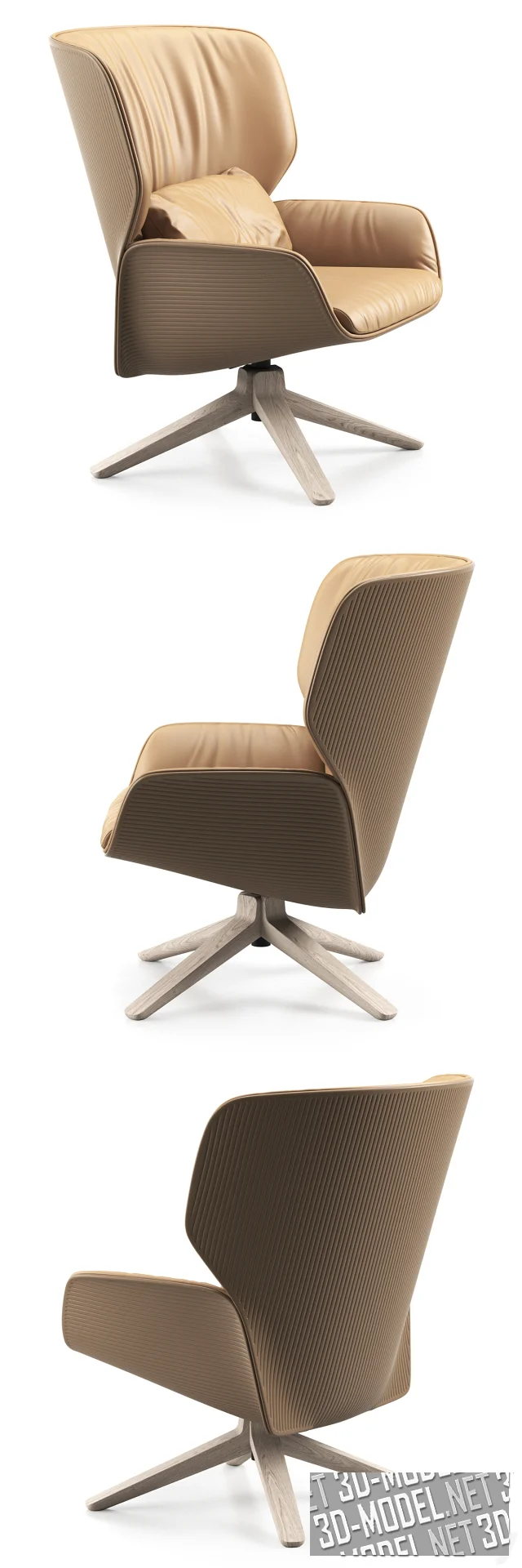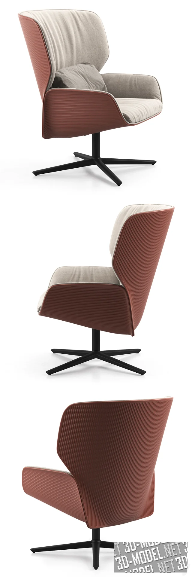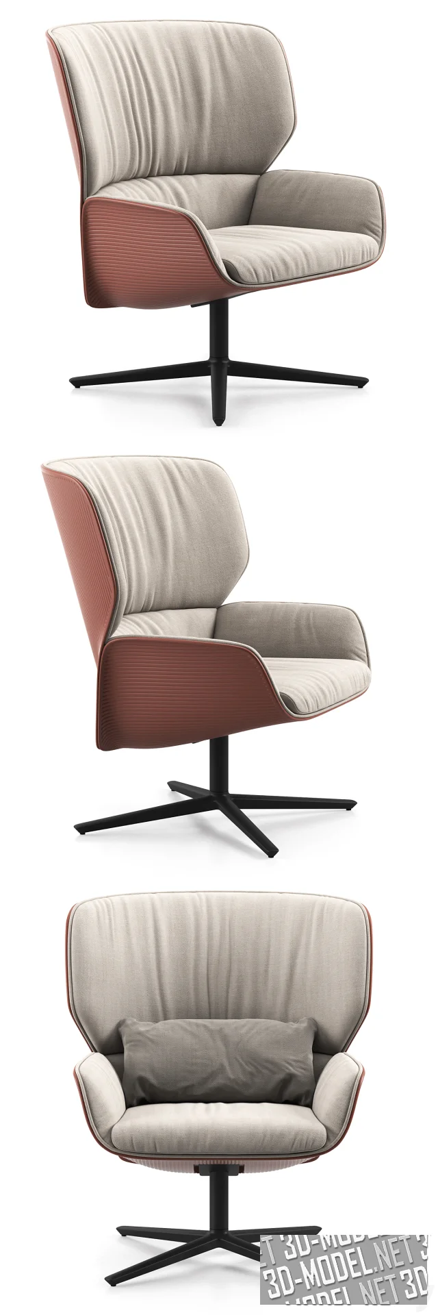 Современное кресло с пуфиком-подставкой для ног, модель Nuez lounge bio от Andreu world. Два элемента с мягкой обивкой (сиденье с невысокими подлокотниками и огибающая спинка) и гнутыми плоскостями в основании смонтированы на крестовине. Кресло представлено в двух вариациях. На черной металлической крестовине с наружной обивкой бледно-терракотового цвета и текстильной светло-серой обивкой внутри. Второй вариант - с деревянными накладками на крестовине, бежевыми наружными плоскостями и светло-охристой эко-кожей. Кресла дополняются небольшой подушкой в чехле цвета обивки. Наружные плоскости декорированы мелкой частой прострочкой. Пуфик выполнен в форме скругленного куба с обивкой, как на внутренних плоскостях кресла. Габарит кресла: 86х80,5х102см. Габарит пуфа: 57х45х38,5см.