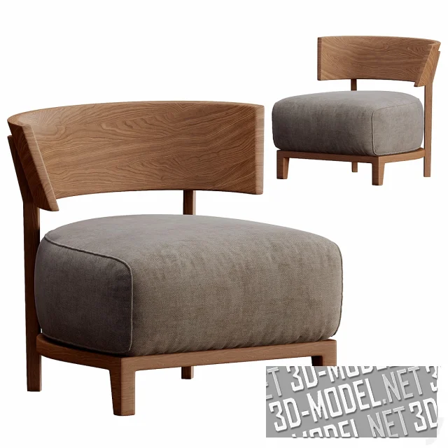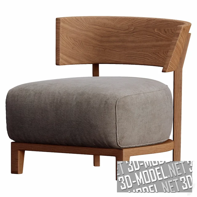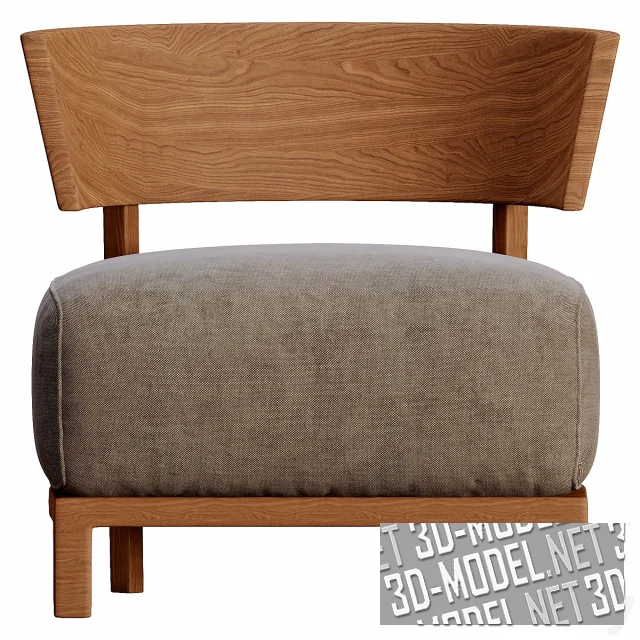 Небольшое современное кресло в стиле кантри - модель Thomas от Flexform. Большая мягкая высокая подушка обита текстилем с текстурой и цветом грубого холста, размещена на низкой деревянной раме с небольшими ножками. Огибающая спинка выполнена из толстой гнутой горизонтальной доски. Габарит кресла: 64х69х66см.