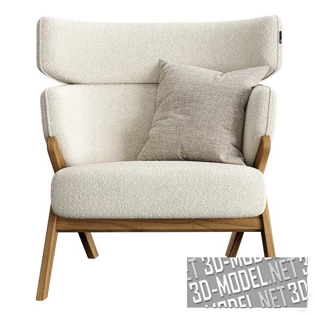 Современное кресло StudioF от Cordial. Кресло с белой буклированной обивкой на деревянном каркасе с Л-образными ножками. Огибающая спинка разделена на два элемента: спинку и подголовник. Габарит кресла: 90х86х100см.