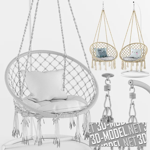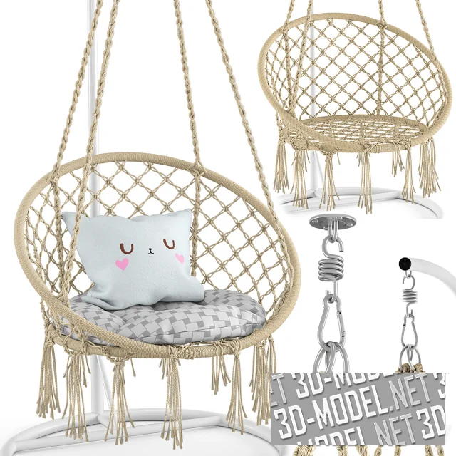Современное кресло-гамак Ohuhu, подвешенное на белой металлической стойке с круглой подставкой. Круглые обручи, формирующие основу кресла, оплетены шнуром натурального цвета. Плоскость спинки, подвесные канаты и декоративные кисти по периметру выполнены в технике макраме из того же материала. Сиденье дополняет мягкая подушка в бело-сером чехле. Небольшая декоративная подушка в пестром чехле (представлено два варианта - с рисунком медведя и со стилизованной мордочкой котенка) дополняет модель. Гамаки представлены в двух типоразмерах: с диаметром кольца 60см и 80см.