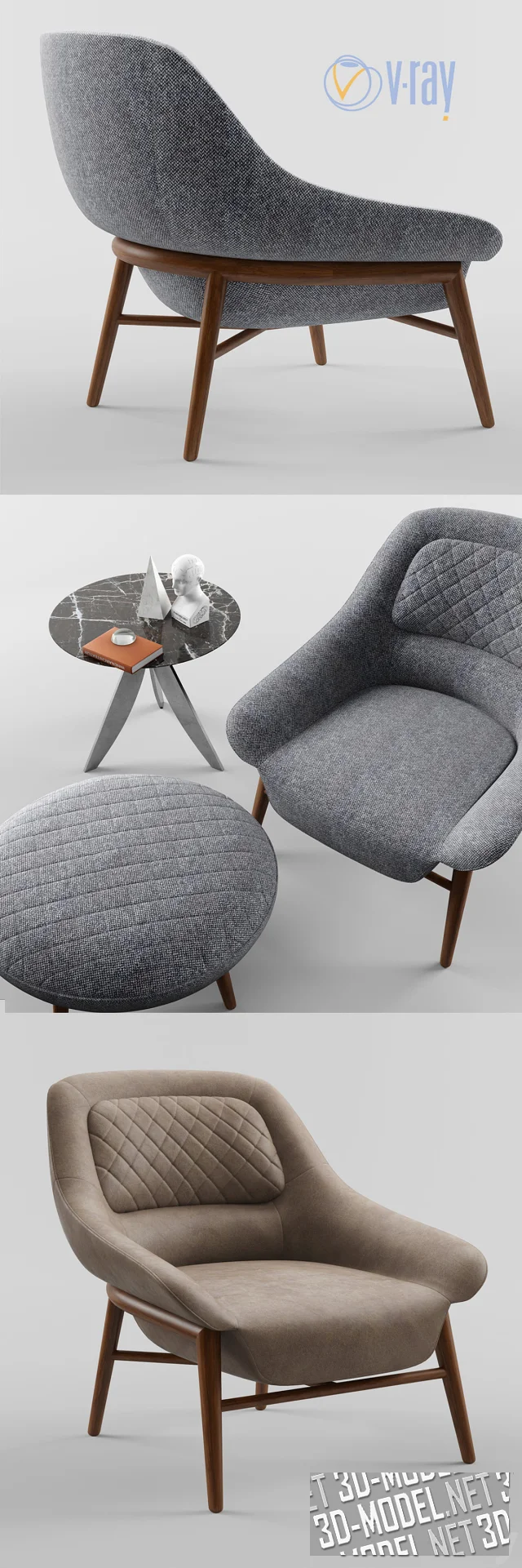 Небольшой комплект для современной гостиной - кресло HANNA от Berto Salotti, круглый пуф-подставка для ног из той же коллекции, приставной круглый стальной столик со столешницей из черного мрамора и декор на столе. Кресло на деревянной раме с ножками и пуф представлены в двух видах обивки: бежевая кожа и серый мелажнжевый текстиль. Габарит кресла: 86,5х83х85см. В качестве декора на столе присутствует белый скульптурный бюст, книга, стеклянная «капля» пресс-папье и белая пирамида.