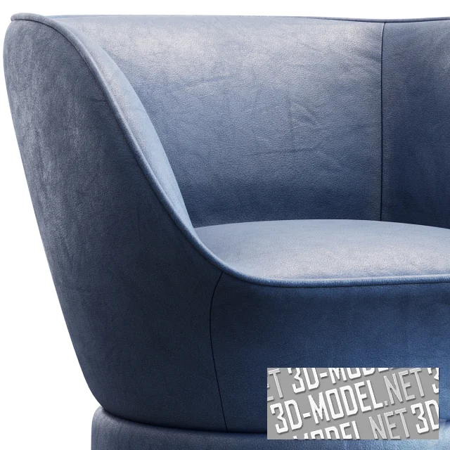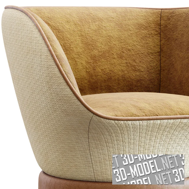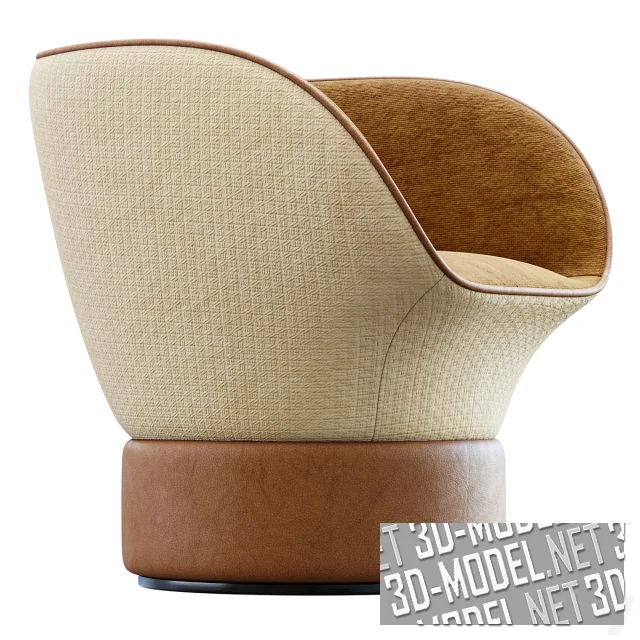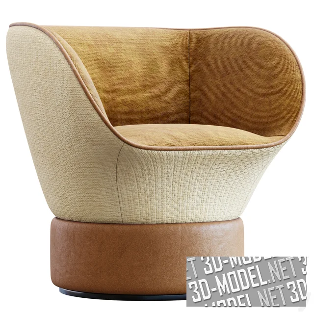 Вращающееся кресло Cala от HC28, с круглым основанием, огибающей невысокой спинкой и скругленными подлокотниками. Представлено два варианта отделки. Первый - в сочетании светло-коричневой кожи (внизу), соломенного цвета рельефный текстиль (с наружной плоскости) и охристый с текстурой холста (на внутренних плоскостях). Шов между этими плоскостями декорирован толстым шнуром из светло-коричневой кожи. Второй вариант обивки - из кожи синего цвета.
