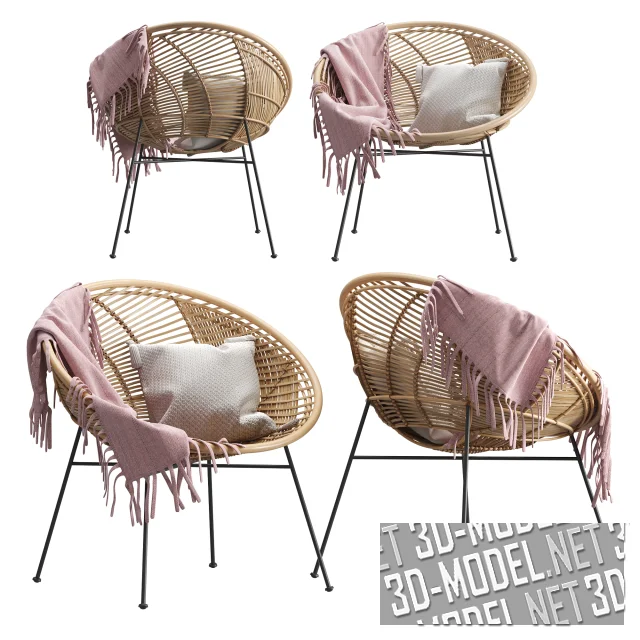 Легкое круглое кресло из ротанга от HK-Living. Кресло на тонких высоких черных металлических ножках, с розовым пледом и небольшой подушкой. Асимметричное плетение создает в круглой раме уютное углубленное сиденье.
