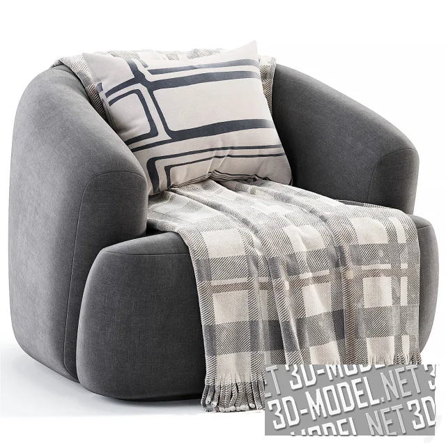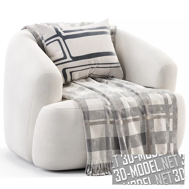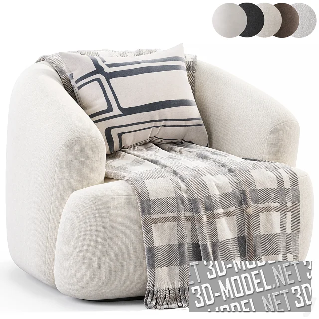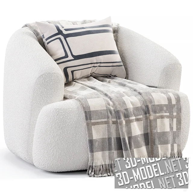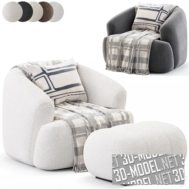 Небольшое современное мягкое кресло Sofia от Westwing. В комплекте с округлой мягкой подставкой для ног. Состоит Sofia из огибающей толстой мягкой спинки, переходящей в подлокотники и мягкого массивного сиденья на невысоком черном цоколе. Габарит кресла: 90х72х97см. Обивка представлена в пяти вариантах: белое букле, белый текстиль с текстурой холста, велюр белого, серого и бледно-коричневого цветов. Модели дополнены клетчатыми пледами и небольшой квадратной подушкой в черно-белом чехле.