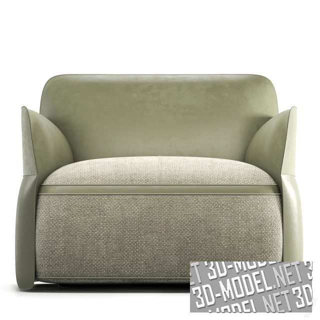 Современное массивное кресло Vela от Nicoletti Home (Италия). Обивка оливкового цвета скомбинирована из кожи и крупнотекстурного текстиля. Массивный корпус сиденья, обитый текстилем, имеет горизонтальную вставку из кожи. Прямые подлокотники и невысокая прямая спинка также обиты кожей.