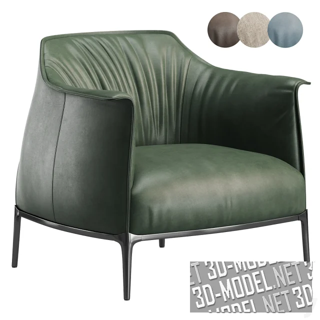 Основание состоит из четырех литых алюминиевых ножек и трубчатой стальной рамы. Кресло обито кожей Pelle Frau® с контрастной строчкой или съемной тканью. Три цвета (темные оттенки голубого, зеленого и коричневого) смотрятся стильно, изысканно и богато. Archibald – это тот случай, когда оптимальный комфорт не заглушает оригинальную дизайнерскую задумку.