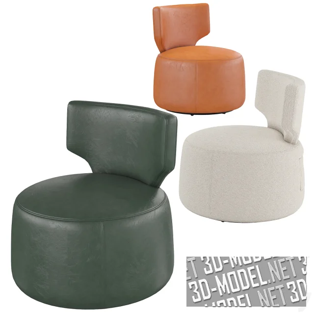 Современный вариант вращающегося акцентного кресла. Отличается круглым массивным сиденьем и небольшой мягкой фигурной спинкой. Обивка представлена в трех вариантах: белое букле, темно-зеленая и оранжевая кожа. Габарит кресла: 73х73х76см.