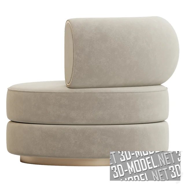Современное круглое вращающееся кресло BOBOLI от Goldconfort. Корпус выполнен в виде двух мягких круглых «шайб» на золотистом металлическом цоколе. Спинка с небольшим прогибом изготовлена в виде мягкого валика овального сечения. Торец валика декорирован золотистой вставкой. Обивка из велюра песочного цвета. Кресло дополнено небольшой свободнолежащей квадратной подушкой в чехле с черно-белым орнаментом «гусиная лапка».