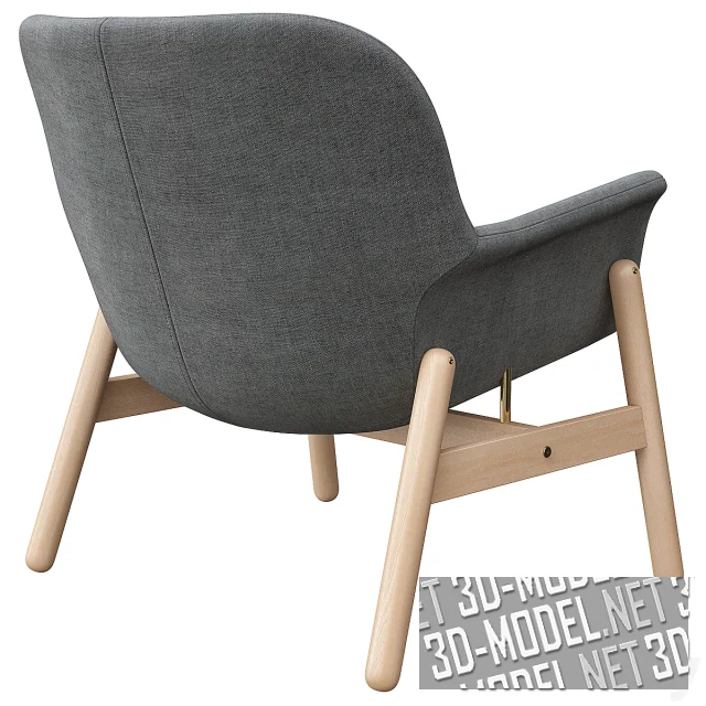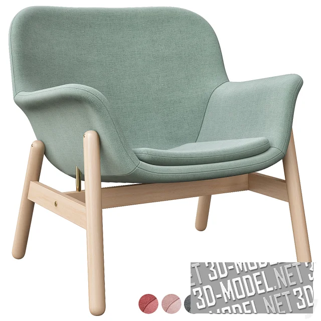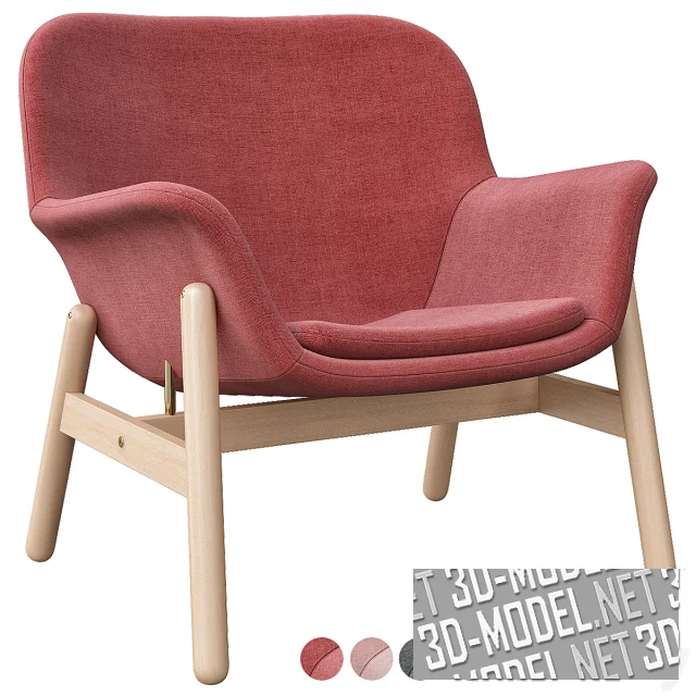 Легкое современное кресло Vedbo M от Ikea на деревянной раме. Ножки продолжаются чуть выше линии рамы и имеют с двух сторон скругления. Сиденье составляет единую деталь с плавно расширяющимися подлокотниками и невысокой, немного выгнутой спинкой. Корпус и подушка на сиденье обита текстилем в пяти цветах: красный, бледно-розовый, светло-мятная, бледно-синий, серый. Деревянные части с текстурой светлого дерева под прозрачным лаком. Габарит кресла: 73х65х75см.