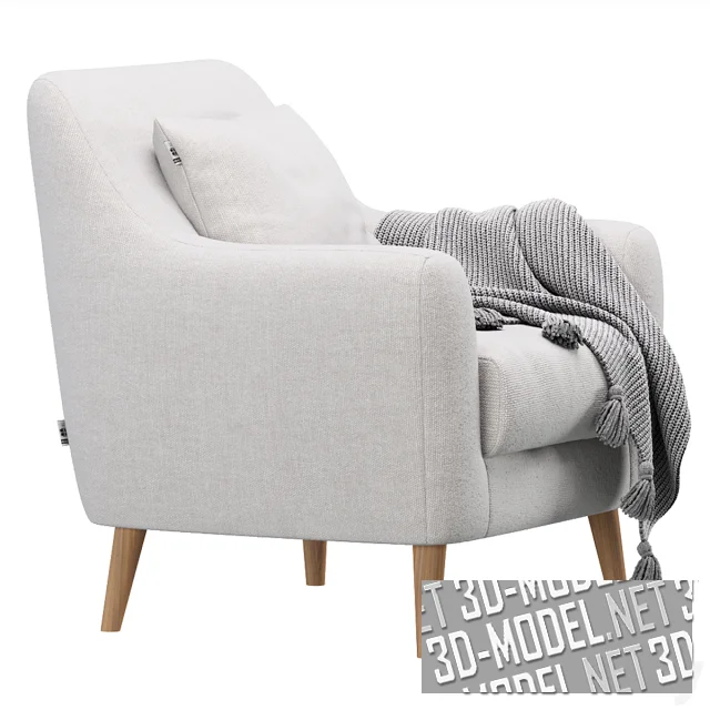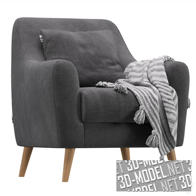 Современное кресло Odense от Divan.ru, в скандинавском стиле. Простое кресло на невысоких деревянных ножках, с прямыми подлокотниками и спинкой. Спинка дополнена квадратной подушкой. Мягкие элементы обиты велюром. Представлено три варианта. Это кресло с грязно-белой обивкой, деревянными ножками под лаком, дополненное серым вязаным пледом с декоративными кистями. Второе: с темно-серой обивкой, деревянными ножками и полосатым пледом с кистями. Третье: темно-охристое, с черными ножками и подушкой, декорированной рельефным крестом.